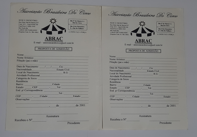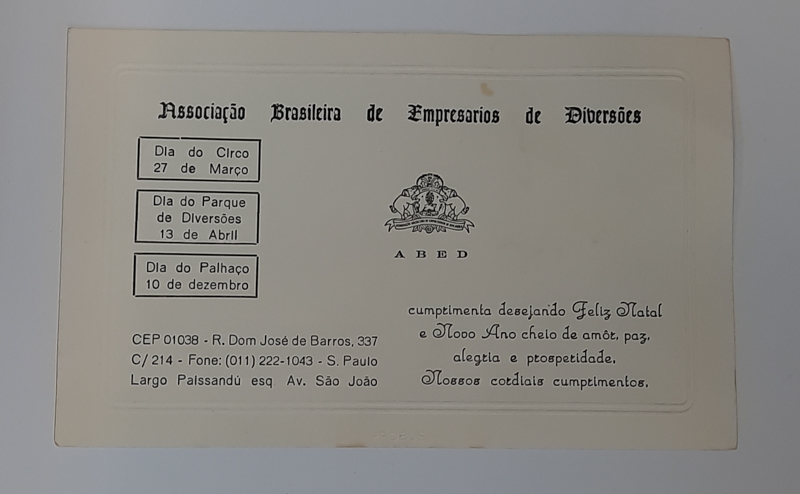 A coleção ABRACIRCO dispõe de 6.189 documentos no nível de acesso 1* e trata da Associação Brasileira de Empresários de Diversões (ABED), que em 2001 mudou de denominação para Associação Brasileira de Circo (ABRAC) e, em 2004, adotou a sigla ABRACIRCO. A instituição atuou também na contratação de artistas circenses por empresários em São Paulo no final do século XX e início do século XXI. Locada no Largo do Paissandú, a associação, seus sócios e presidentes foram parte fundamental dos famosos encontros do “Café dos Artistas”. Integram a coleção 250 documentos iconográficos, 5.868 textuais, 2 fonográficos, 67 documentos tridimensionais e 2 audiovisuais. Esse número é acrescido por duas caixas de acondicionamento que guardam documentos contaminados, em análise e aguardando o tratamento adequado.